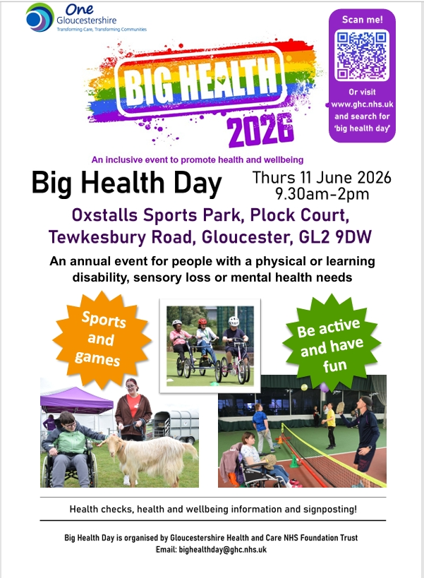 Big Health Day is an annual event for people with a physical or learning disability, sensory loss or mental health support needs. It aims to be a fun and inclusive event which encourages people to participate in sport, physical exercise and social activities and to engage with services and organisations which can provide support. It has run for 17 years at different venues. For the last few years it has been held at Oxstalls Sports Park in Gloucester.